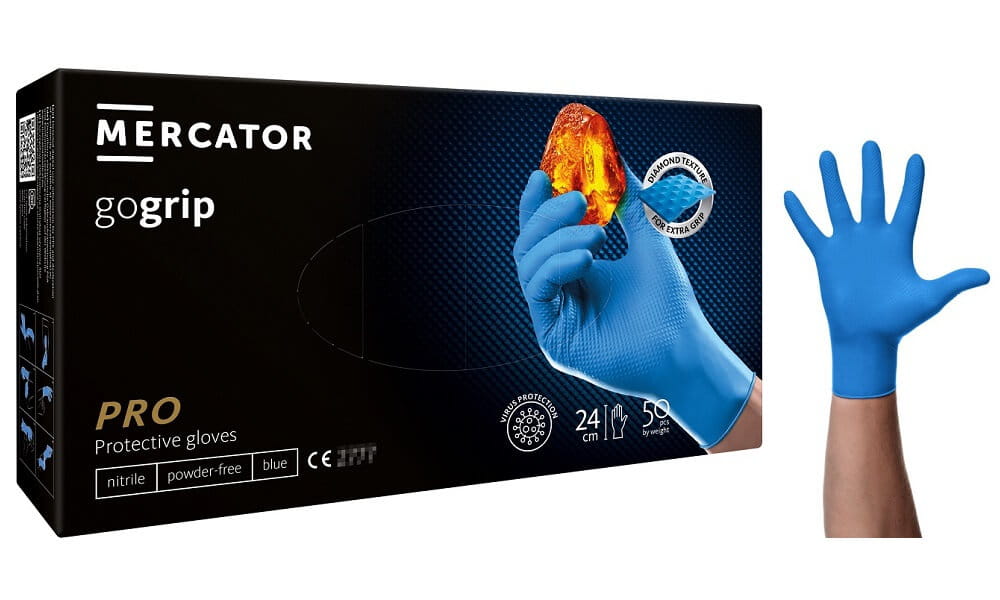 GOGRIP BLUE to profesjonalne rękawiczki jednorazowe wykonane z grubego nitrylu, stworzone z myślą o pracy w trudnych i wymagających warunkach. Charakteryzują się trójwymiarową strukturą powierzchni typu diamond grip, która zapewnia znakomitą przyczepność – nawet w kontakcie z wodą, olejami, smarami czy środkami chemicznymi.
