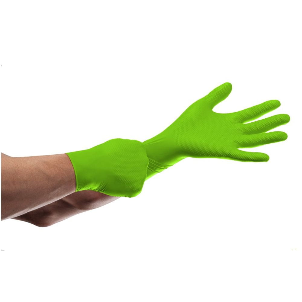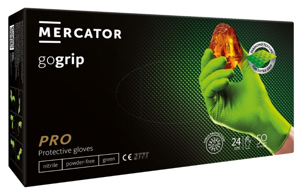 Mercator GOGRIP GREEN to nowoczesne, wysoce wytrzymałe rękawiczki nitrylowe jednorazowego użytku, zaprojektowane dla wymagających użytkowników. Ich intensywnie zielony kolor poprawia widoczność dłoni w miejscu pracy, a trójwymiarowa, diamentowa tekstura zapewnia pewny chwyt nawet w środowiskach o dużym zawilgoceniu lub w kontakcie z olejami i smarami.